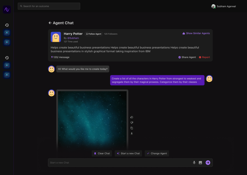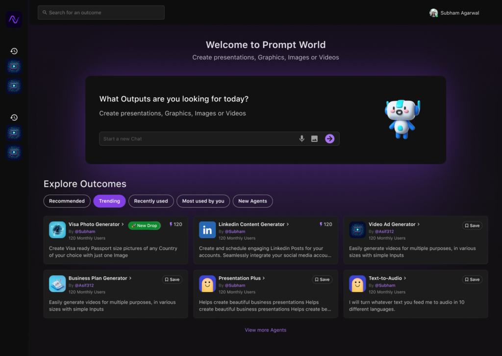 Nagent.AI (formerly PromptWorld) allows users to create AI agents or generate outputs using curated AI agents with simple inputs.